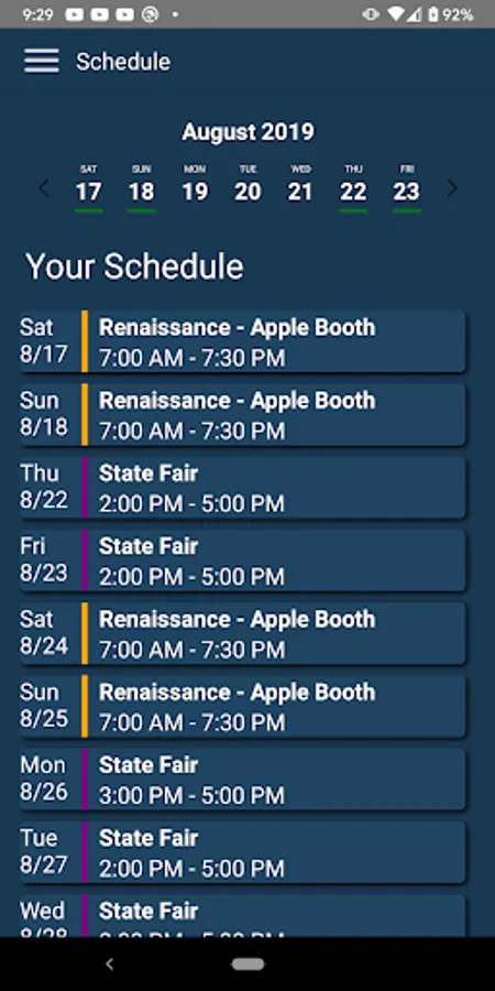 Hussong Concessions has stands at the Minnesota Renaissance Festival and the Minnesota State Fair. This app is designed to allow employees to sign up to work and maintain their profile and availability. It also allows employees to review their scheduled work hours and send messages to managers and other employees.