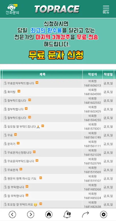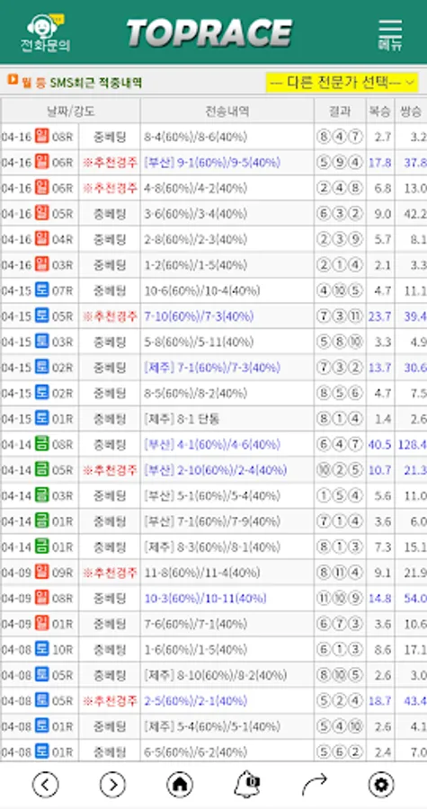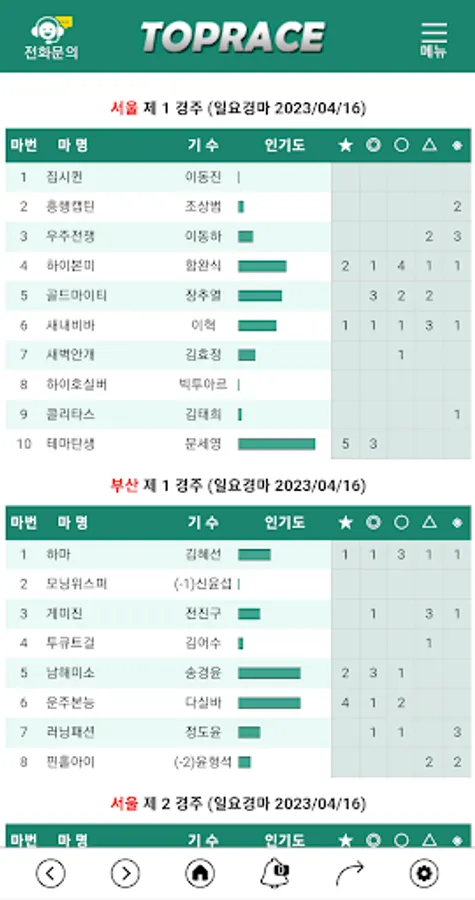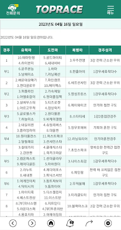◎ SMS Breaking News of Top Race Horse Racing is an SMS text information service from Korea's best horse racing experts, and you can receive horse racing breaking news 10 minutes before the race.