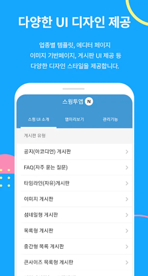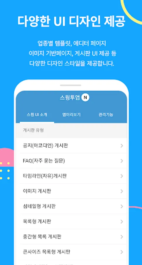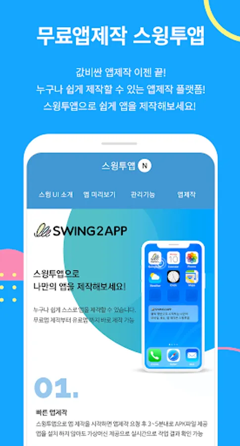 In Swing, app basic information, design theme selection, menu setting. Create your own app in these three simple steps.