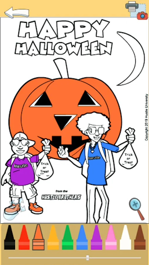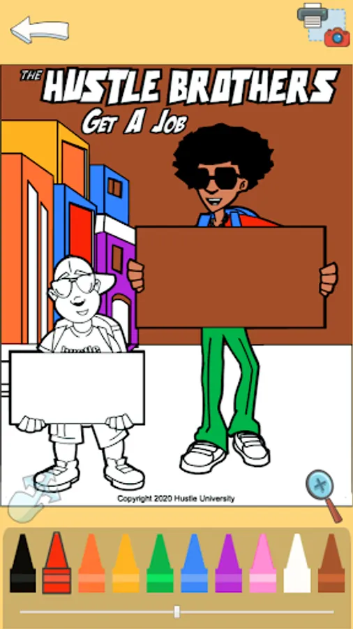 The Hustle Brothers need some color! Select a page and color it any way you want. You have full control. Let your imagination run wild! Use the slider to create different shades of a color. And when you are finished, you can download your artwork or print it!