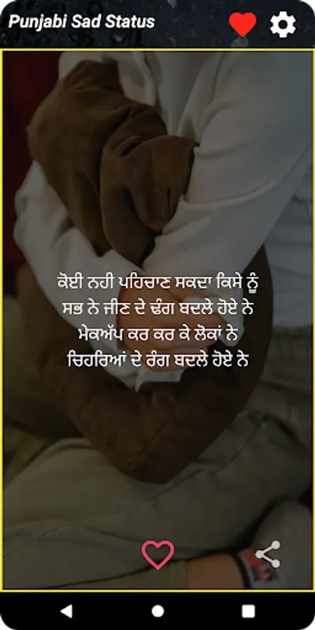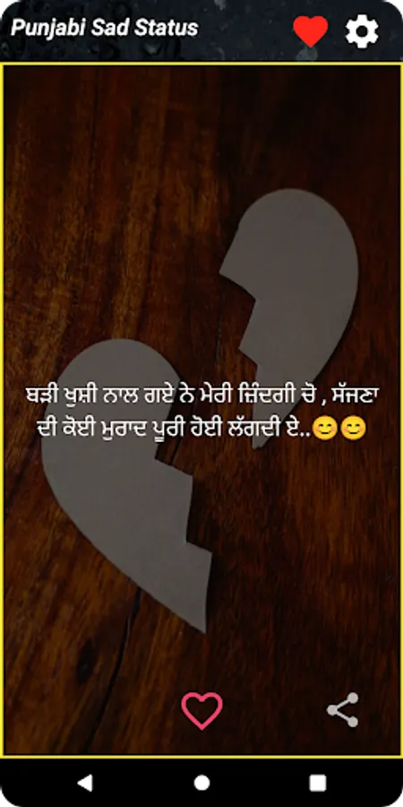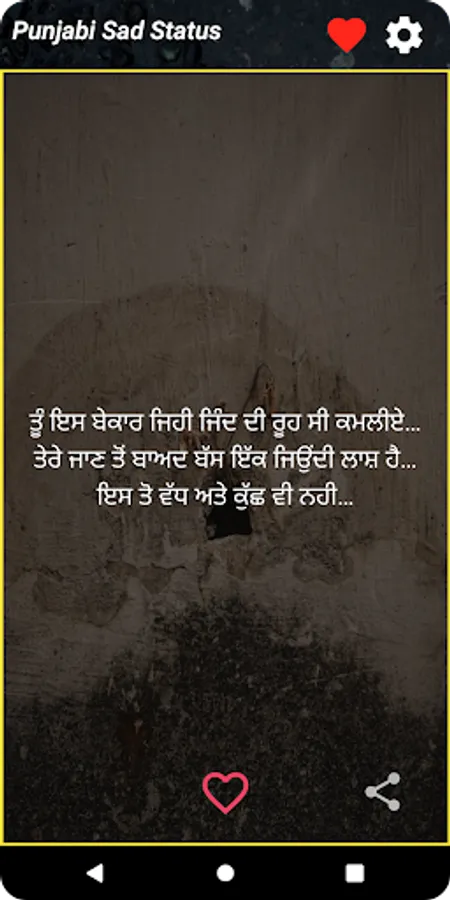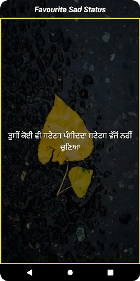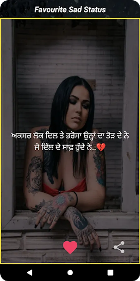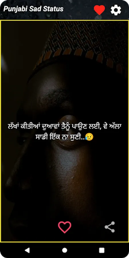 The Punjabi Sad Status App Is a collection of Punjabi sad status, Punjabi sad song status, Punjabi sad shayari, Punjabi bewafa shayari, Punjabi dukhi shayari, dard bhari shayari Punjabi, and many more.