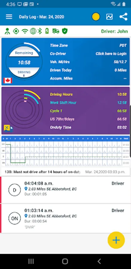 Hours of Service violations and alerts are calculated as per selected USA or Canada HOS rules. The Hutch Connect keeps you worry-free and saves you and your company from fines and CSA scores.