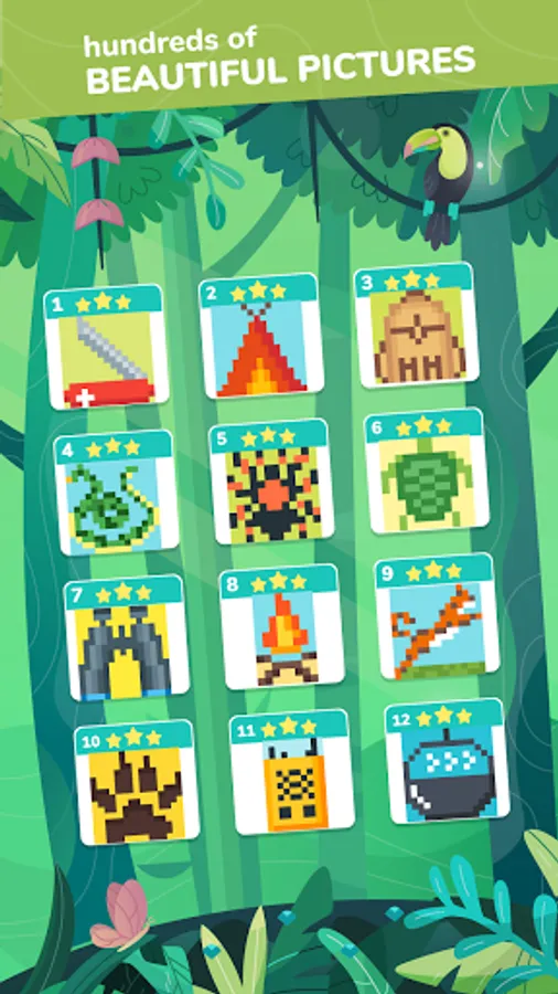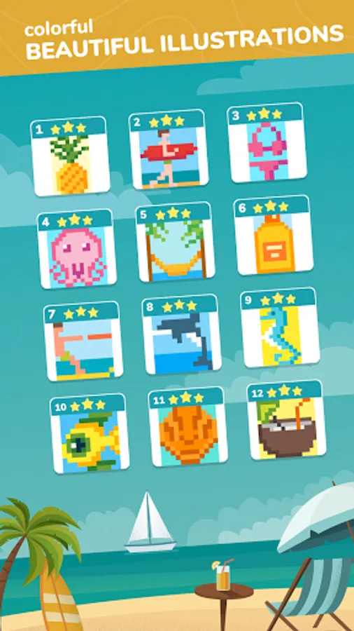 The current nonogram is grouped into colorful thematic packs. All picture puzzles have their size and difficulty levels indicated, so you can choose the right one by your skill, mood or time available. That way this picture cross will never get you bored.