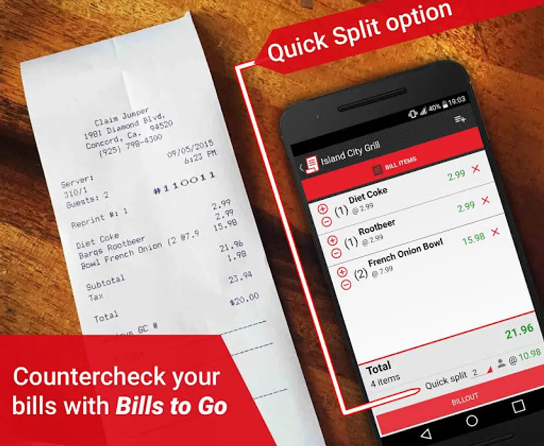 Bills to Go is basically a Bill splitter and bill manager. It allows you to keep track and monitor your bills. This application helps avoid the hassle of, first, having to recheck the bill, and second, having to manually split it among your friends based on their corresponding orders. Furthermore, you can build the bill realtime.