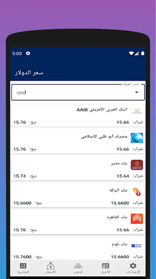 التطبيق الأفضل لمتابعة سعر الدولار أمام الجنيه المصري و اختيار أفضل عرض سعر عند البيع و عند الشراء- تابع أسعار الذهب و الحديد - أسعار اليوروو الريال السعودي -أسعار العملات المختلفة بالبنك المركزي - التطبيق لا علاقة له من قريب أو بعيد بأي سعر غير رسمي أو أي طريق غير قانونية