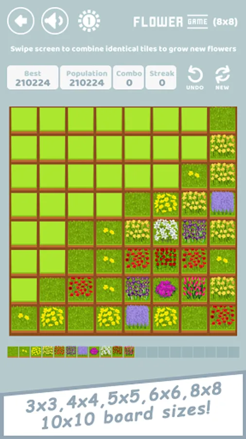 Swipe to match two tiles with the same Flowers to get a new Flower. You will start growing flowers in the garden. The objective of this Flower Game is to plant and match beautiful flowers in a puzzle-filled garden of fun. Your score is given by the size of your plant population. Combine flowers to advance to the next level!