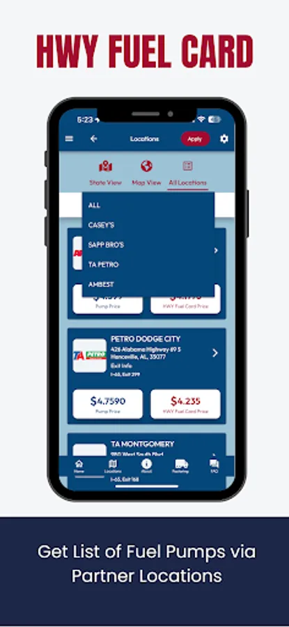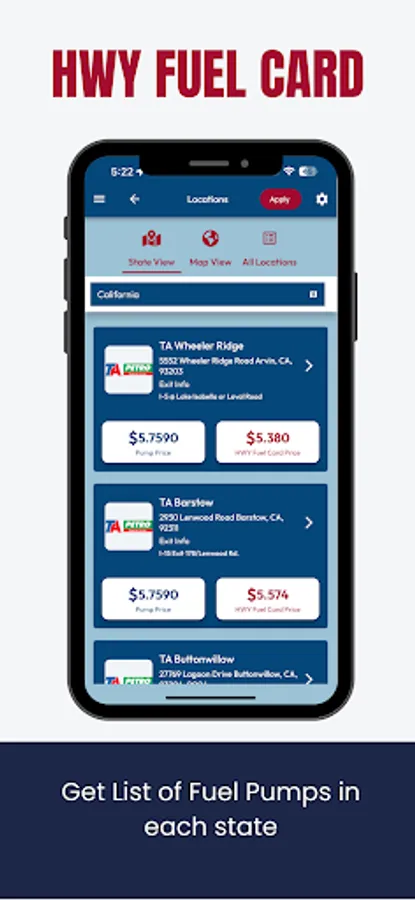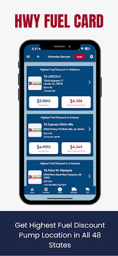 The app is designed to offer you access to Fuel Partner Locations at your fingertip. PUMP Prices at each Location and The HWYFUEL CARD DISCOUNTS at the same location for you to compare the SAVINGS!.