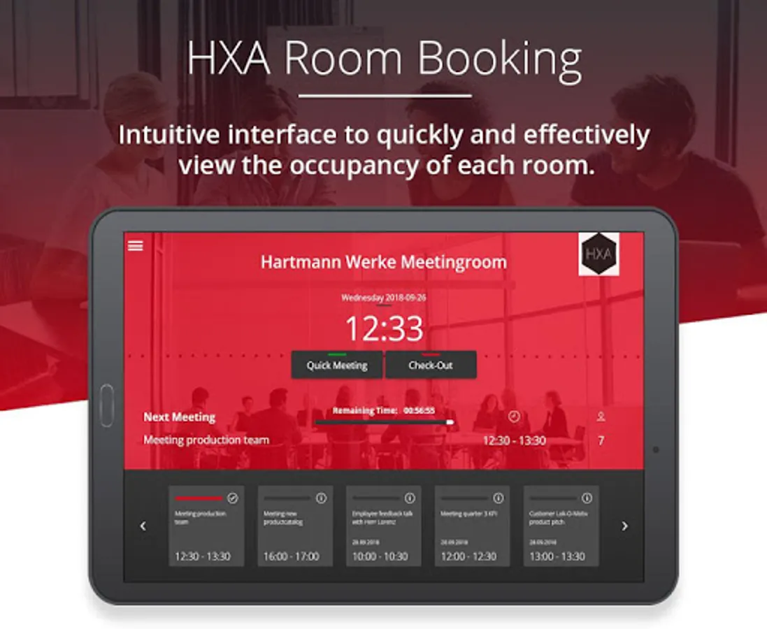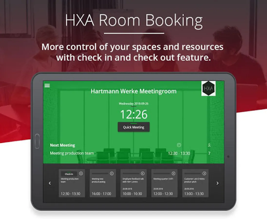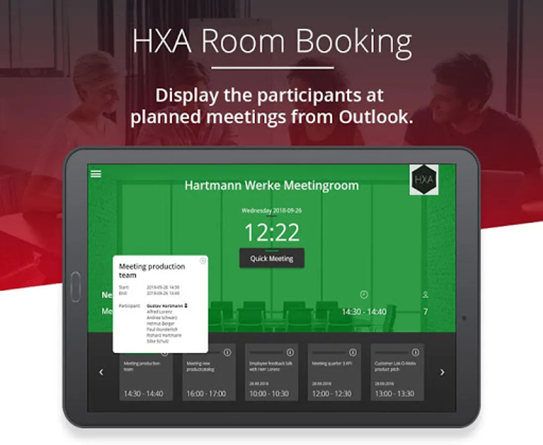 It can be easily connected to an Exchange User Mailbox or Room Mailbox. The app shows upcoming appointments, which were entered in the calendar of the mailbox and allows direct bookings via the button "Quick Meeting".