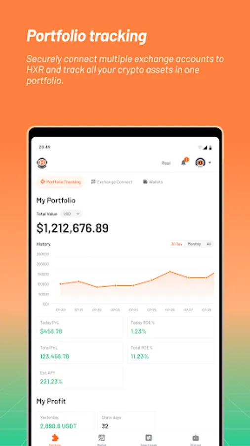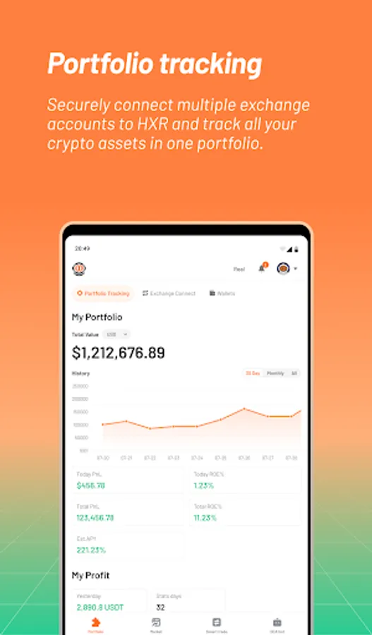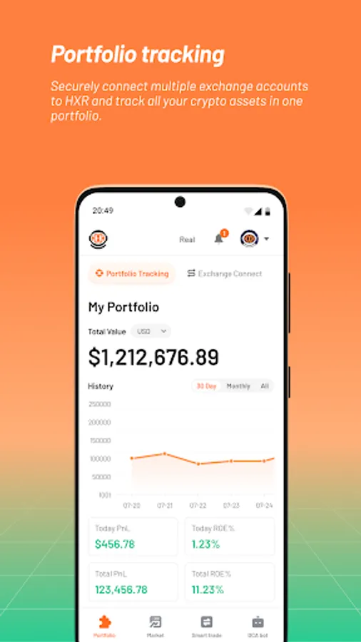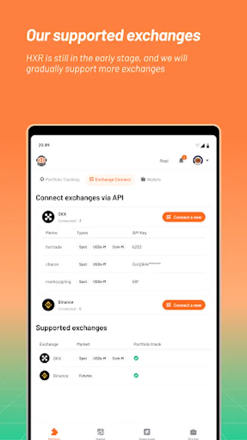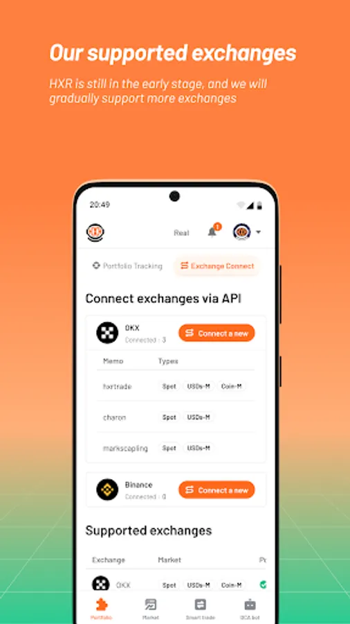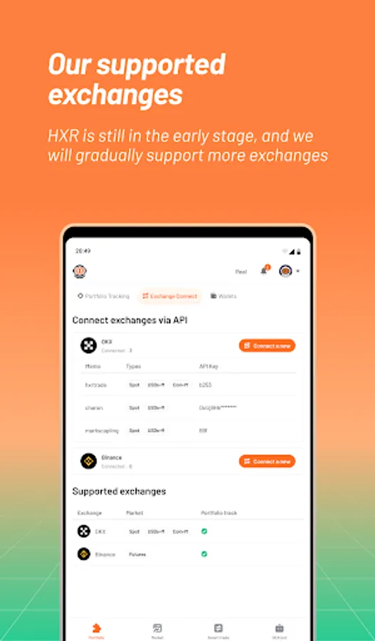 HXR Trade can connect all your favourite crypto exchanges via security API keys and you can track all your crypto assets in one portfolio. It seamlessly integrates with premier markets, including Binance, OKX, and Coinbase, to provide streamlined oversight.