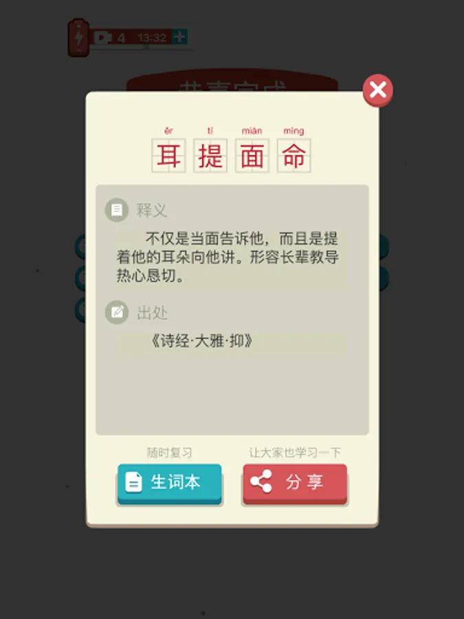The idiom solitaire crossword game is to distribute the idioms in the form of solitaire on a chessboard, hide a part of the text in the alternative answer area, and the player guesses which idiom may be based on the current situation. Every time an idiom is filled in, it will prompt whether it is correct or not in real time. When an idiom is completed, it will become unmodifiable. Get all correct answers to enter the next level.