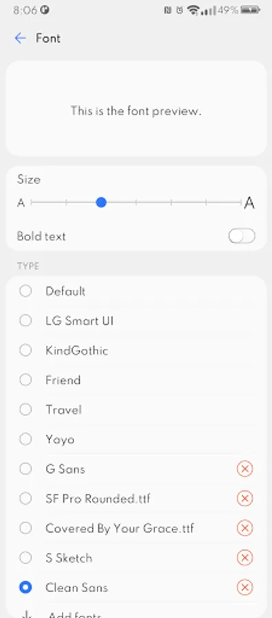 This is Clean Sans font. This font will only work on LG devices that support custom fonts. Typically people have to only get fonts from the build in smart world. However this is an alternative for those who need more options for clean fonts. To apply go into your Settings app. Next go into display. From there select "Fonts" and then select "Clean Sans" and apply it! That's it. Simple and easy to use.