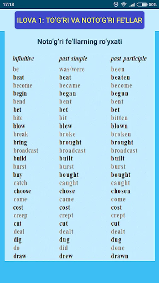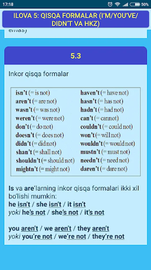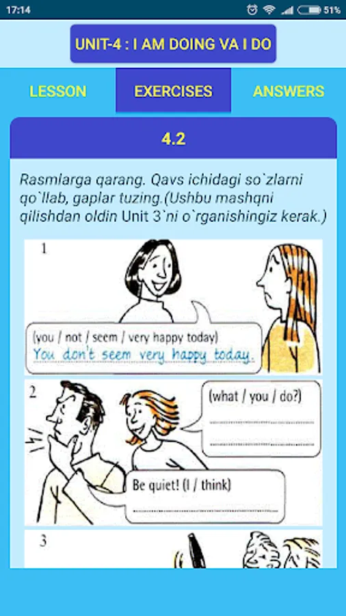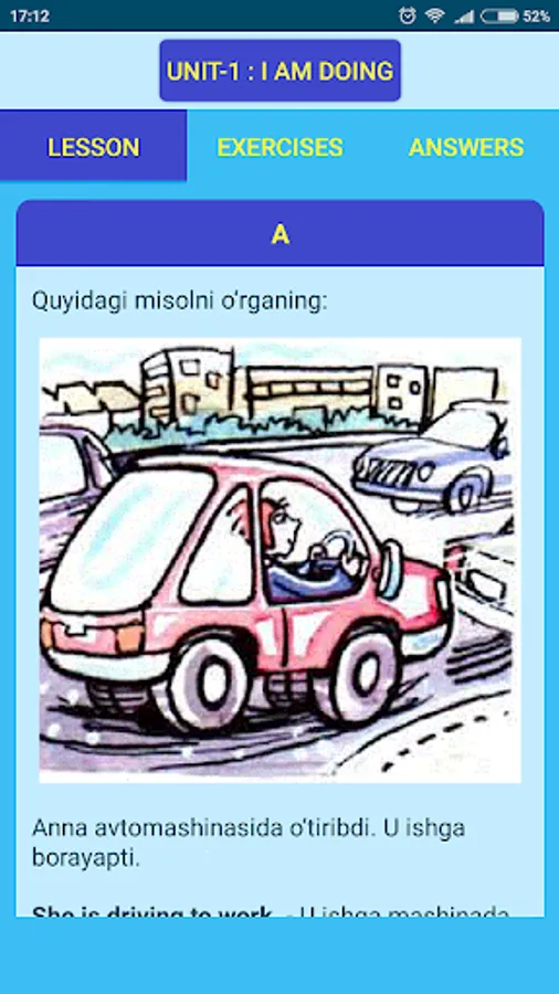 The 136 units of the app cover all sections of English grammar. Each unit deals with a specific topic and consists of ‘Lesson’, ‘Exercises’ and ‘Answers’ sections. There are also additional 7 appendices which go through incorrect verbs, spelling rules, modal verbs, short forms, and nuances about differences between British and American English.