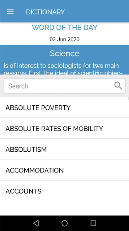 Sociology Dictionary Offline is for Sociology experts and scholars to look up the definitions and technical terms in a second, Sociology Dictionary app containing words and their pronunciation, definition and synonyms. Sociology Dictionary Offline is designed for Sociology students, helping them in their studies Sociology terms.