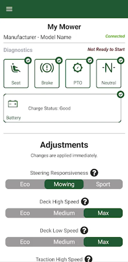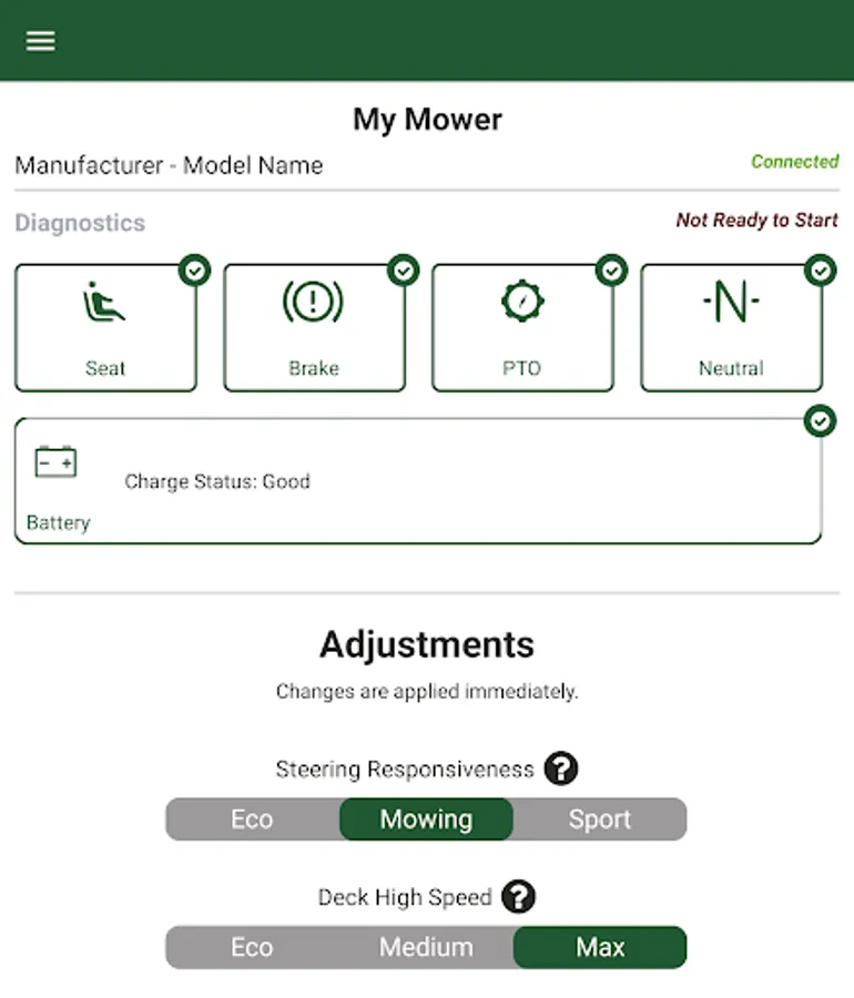 MyMow allows unprecedented customization of your mower. The MyMow app connects to your mower from your smartphone via Bluetooth® using the Smartec Bluetooth Module and automatically detects what type of system you have as well as what adjustments are available for your specific application. The MyMow app can be used to change the ride and feel of your mower, set customized vehicle speed ranges, adjust deck motor speeds and adjust the function of special features such as PowerSafe™ and SmartMow™ (if so equipped). The app provides real-time diagnostics giving insights into your mower like no other.