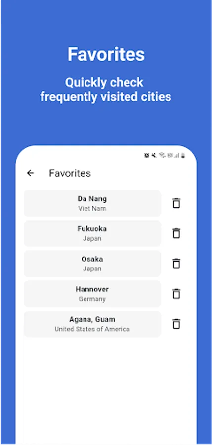 - You can add frequently checked cities to your favorites to quickly check them out.