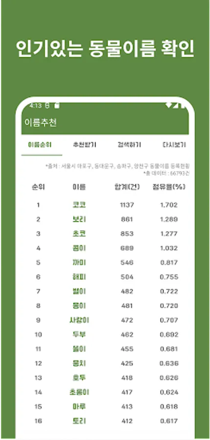 Based on the registration status of 66793 animal names registered in Mapo-gu, Dongdaemun-gu, Songpa-gu, and Yangcheon-gu in Seoul, we check and recommend popular names for companion animals and pets.