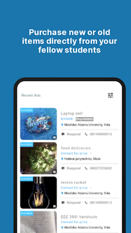 Purchase, sell and barter items and services with your fellow students within your campus or campuses nearby in Nigeria