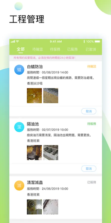 Users can find cleaning and extermination services and help groups through this app. At the same time, you can also check the progress of the project through the App. View related pictures and reports of the project.