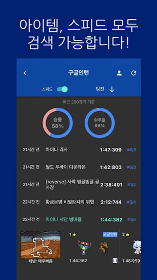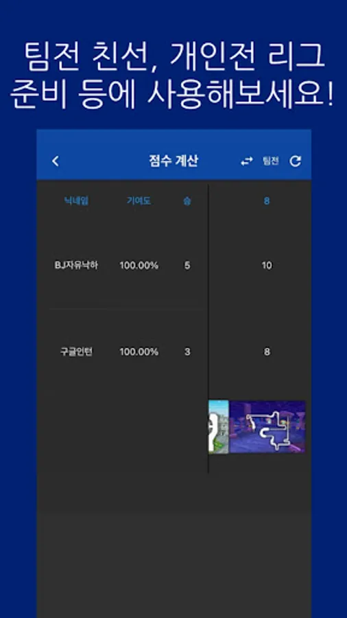 In the karting rider game, you can view the individual item/team battle, speed individual/team battle, club item battle/speed battle record of the desired user. It is also possible to calculate scores for individual/team matches.