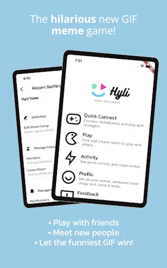 Hyli is is a new game in which players are prompted with fill-in-the-blank style cards and each player chooses the funniest GIF which they think will take the round.