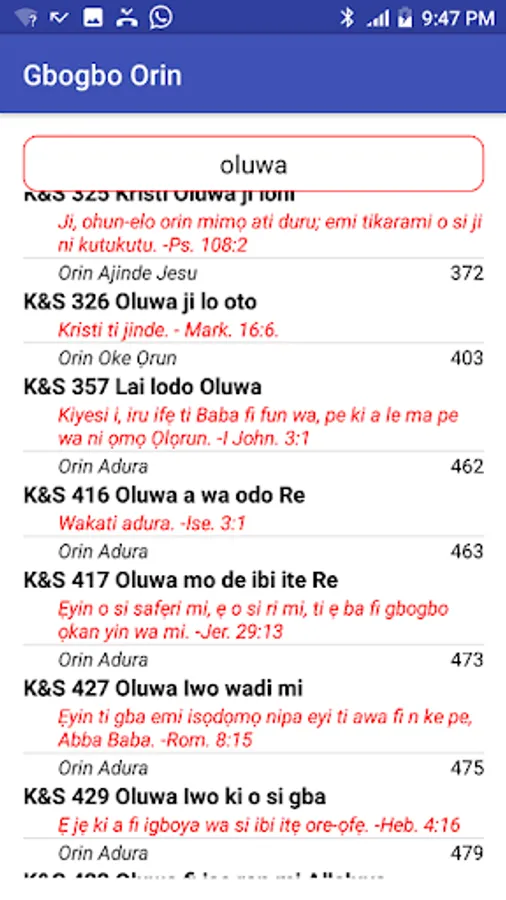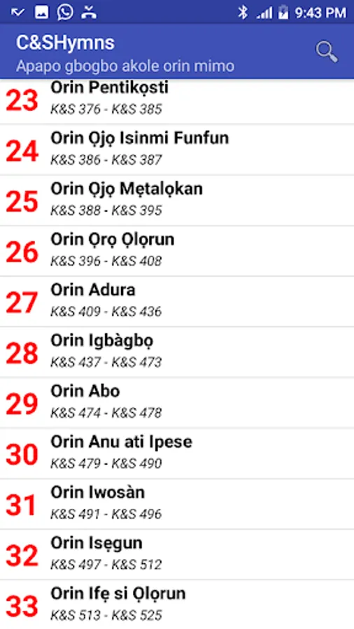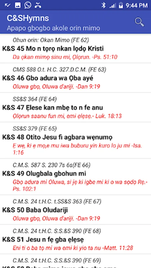 The seraph hymn comes with the full hymns as contained in the hymn book with good look and feel, category of all hymns and easy search feature. Hymns has become mobile for mobile worship and meditation.
