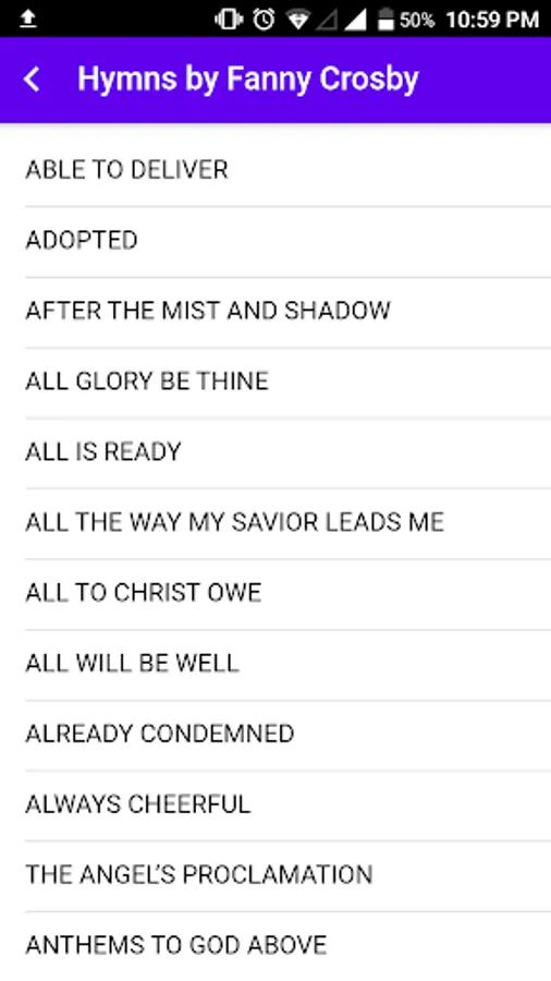 This App contains 684 Christian hymns written by Fanny Crosby.