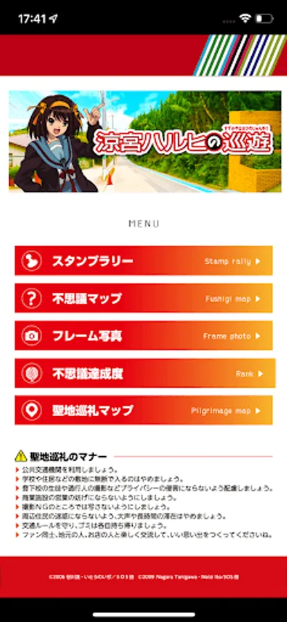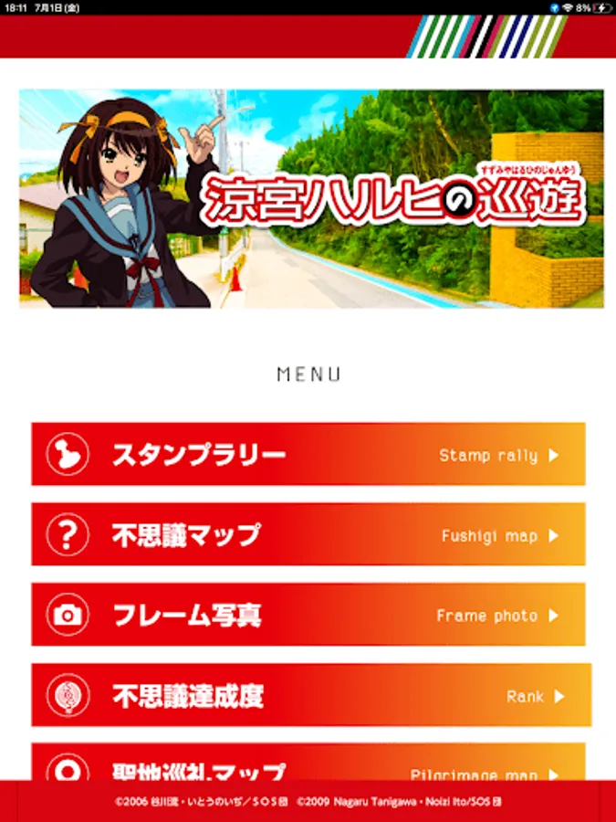 We will perform the navigation necessary for the digital stamp rally, the mysterious discovery in Nishinomiya city, and the pilgrimage to the sacred place of the TV animation "The Melancholy of Haruhi Suzumiya". Please enjoy various menus.