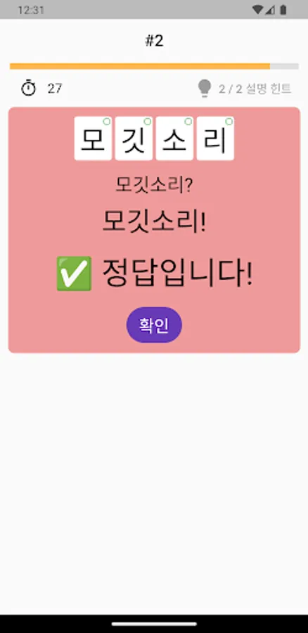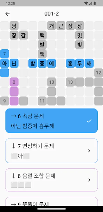 It consists of meaning problems, initial consonant problems, association problems, double word problems, proverbs, and idiom problems, and requires you to enter the correct answer within a time limit (30 to 40 seconds).
