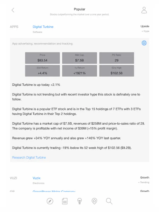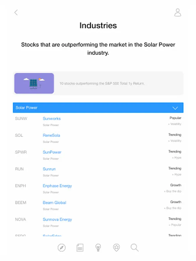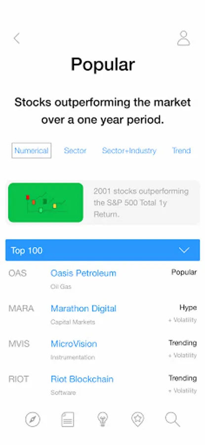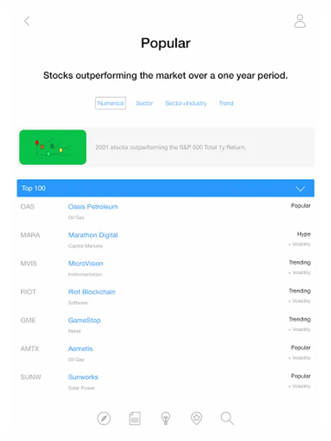 • Popular - Stocks that are outperforming the market over a one-year period.