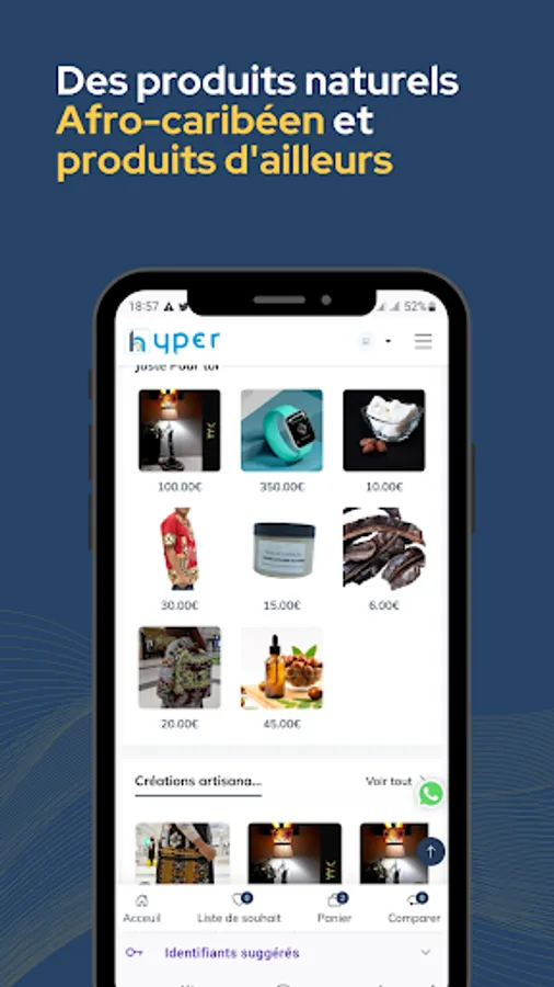 2. Produits made in Africa : L'application met en avant les produits fabriqués en Afrique, offrant ainsi aux utilisateurs la possibilité de découvrir la richesse de l'artisanat africain. Des vêtements traditionnels aux accessoires de décoration, en passant par l'art et l'artisanat, Hyper.Africa propose une large gamme de produits authentiques.