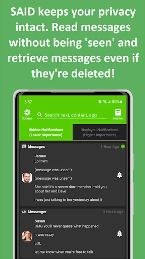 β’ Catch Deleted Messages: Missed a message that was deleted or unsent? SAID's smart technology allows you to capture and read these messages. Never be left out of the loop again.