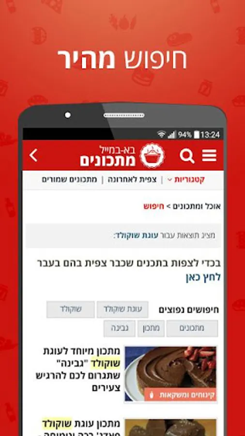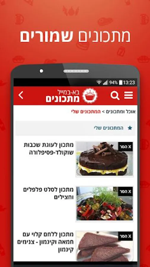 The Ba-Mail recipe app provides you with a huge database of thousands of recipes in Hebrew in a large selection of categories. In the app you will find good food, come in an email Recipes - easy recipes, quick recipes, good recipes, delicious recipes, meat recipes, chicken recipes, fish recipes, vegetarian recipes, vegan recipes, cooking, baking, on the fire, grill, pasta recipes, soup recipes , Recipes for salads, recipes for sauces, recipes for rice, recipes for potatoes, recipes for borax, recipes for pastries, recipes for children, cooking food for children, recipes for the holidays, testimonial recipes, recipe book, recipes for drinks.