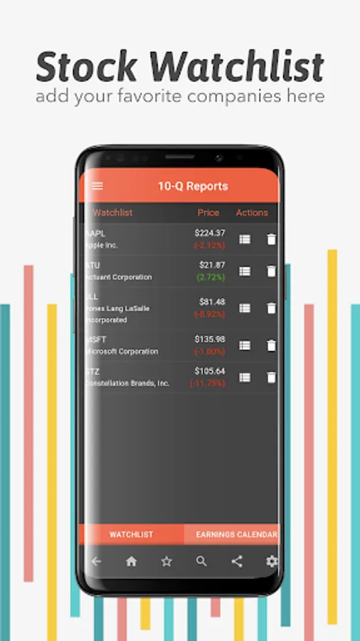 - Easily browse through the Stock Data, 10Q and 10K Filings, Latest News, Watchlist, Earnings Calendar and much more
