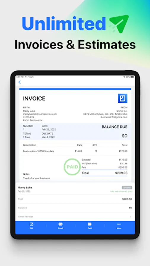 * Create invoices and estimates wherever you are—with a customer, between jobs, or at home