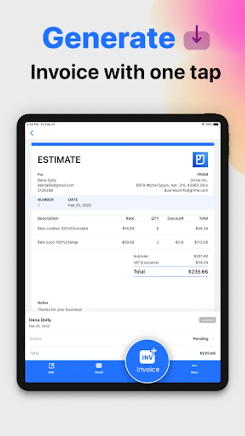 Be the first to send estimates and quotes to your customers and win more jobs, Automatically generate invoices from estimates with one tap. Review estimates and send them quickly.