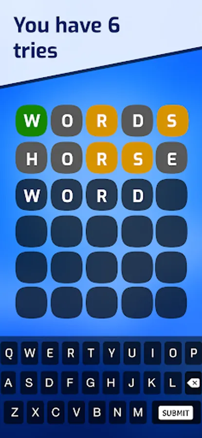 6 Tries 1 Word is very similar to Wordle, the game that took the internet by storm. Wordle is a mobile version of the old TV show Lingo. You have 6 tries to find a word, but don't worry, we will tell you which letter you guessed and which ones you placed right. Unlike Wordle, our game has multiple levels and variable difficulty (you must guess words of different lengths - 4, 5 or 6 letters).