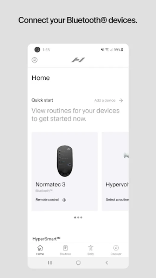 Pair your Bluetooth® connected Hyperice devices, start a routine, and let HyperSmart™ do the thinking. Tap into curated routines, including contrast therapy sessions for the Hyperice X, unlock pro-level features with the Normatec 3 remote feature, and enjoy automated speed setting control for select, connected products in the Hypervolt and Vyper lines.