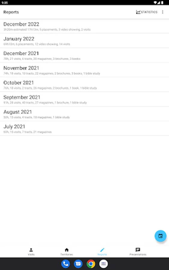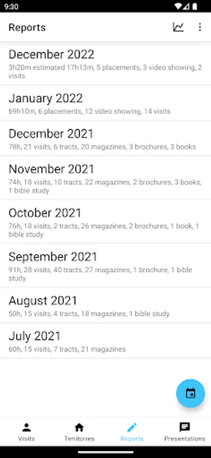• View your months summaries in a graph to check your service trend (hours / visits / tracts / magazines / brochures / books / bible studies)