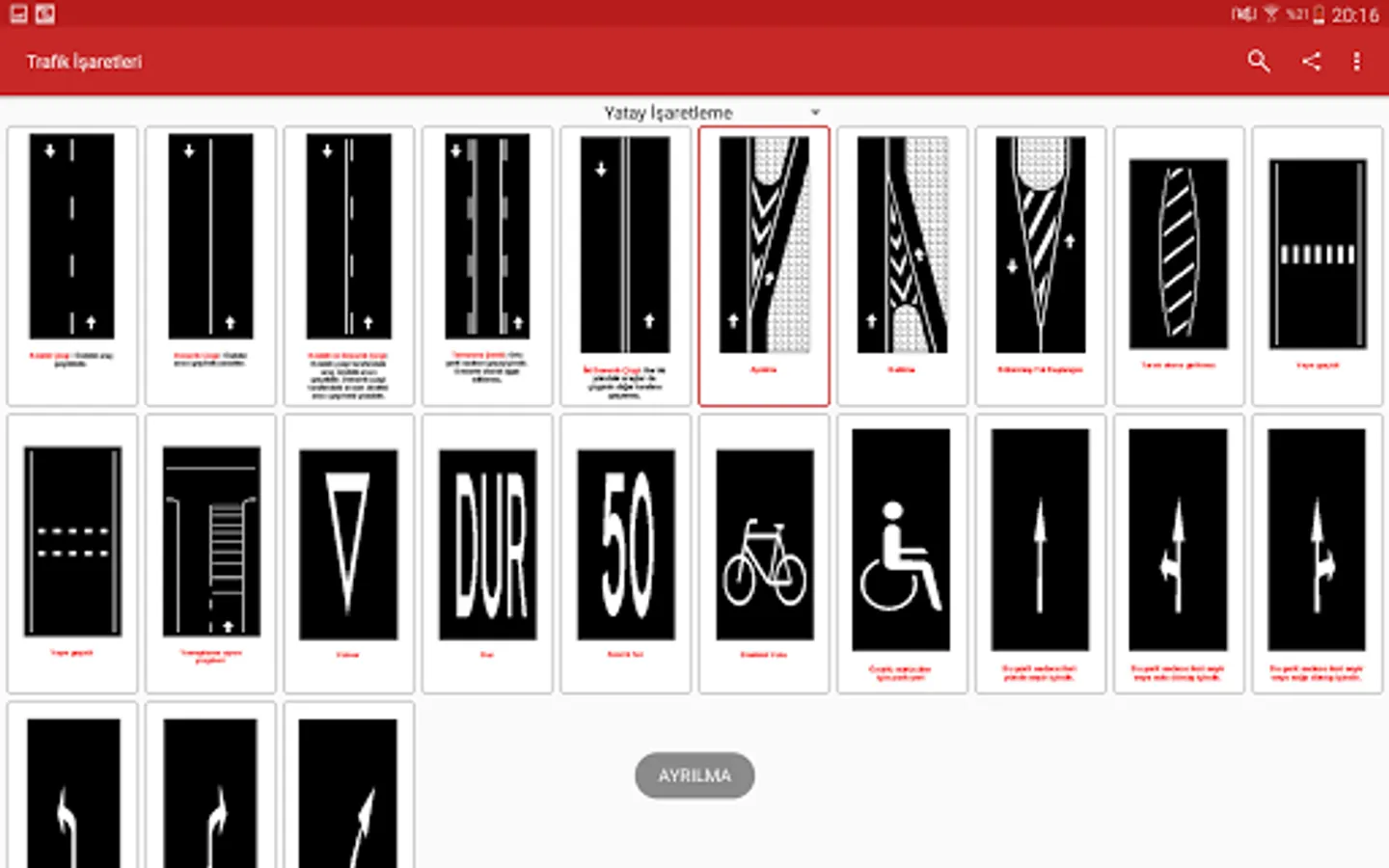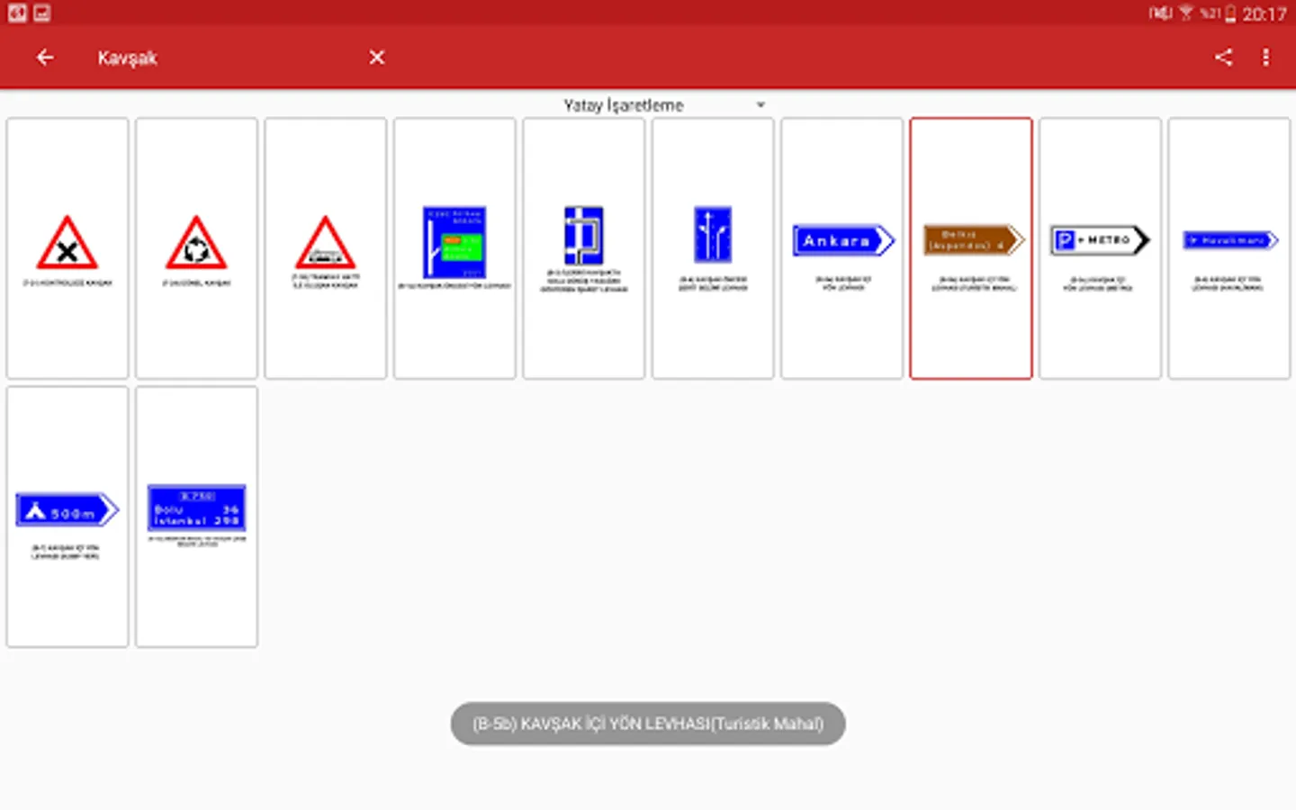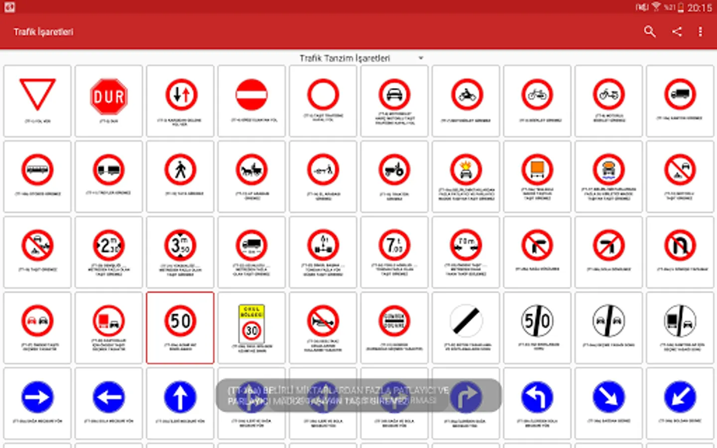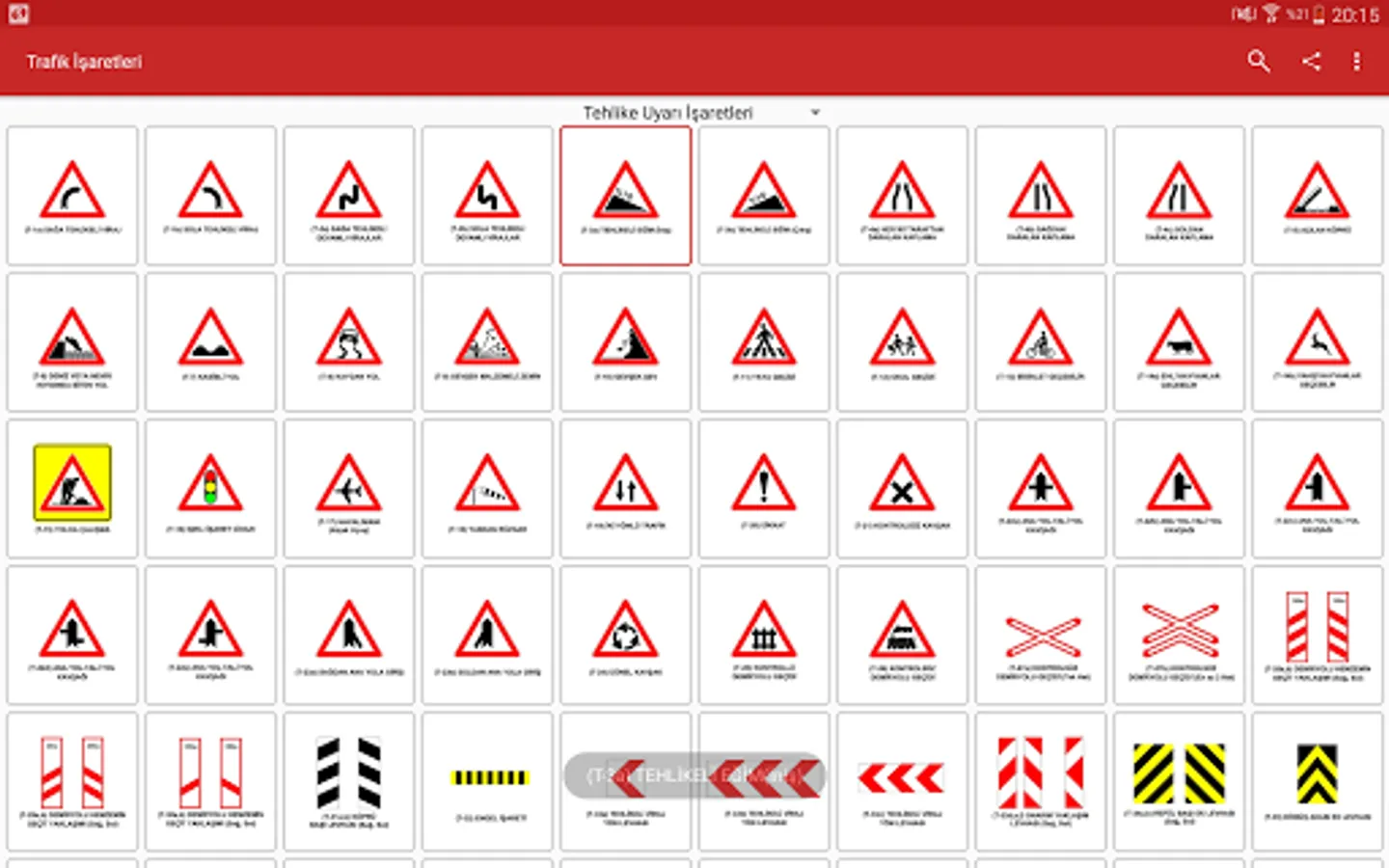 The Traffic Signs are presented to you in 5 groups and you can access the traffic signs in the related area directly from the menu.