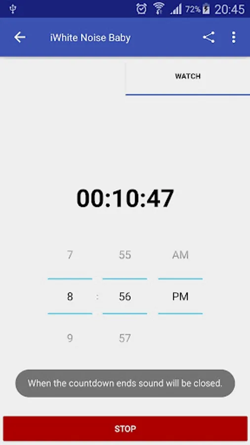 White Noise Baby app has Auto Shutdown Timer. You can set time or minute and application will be closed when the time is over.