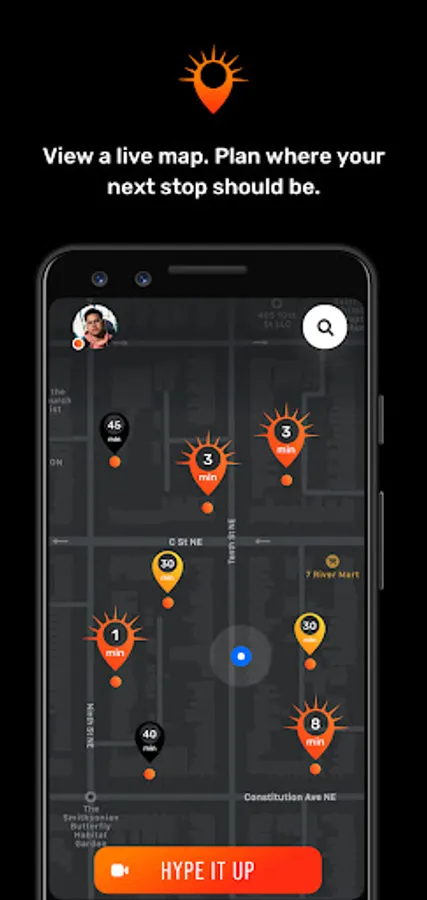 Our community based app helps you find a place that fits your vibe. Use our HypeMap to see out recently hyped restaurants, bars and nightclubs near you. Wherever you go, post a video and earn points each time you hype.