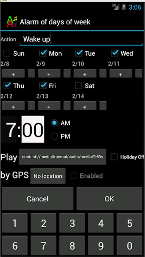 A: Activated By GPS. Specify the area with Google map when you add a new entry. When the alarm time is up, it will check if the location is within the area. If it matches, it will ring. If there is no match, it will check continuously for one hour. You'd better test it before you actually use it because GPS signal may be too weak. This function is useful for commuters to avoid oversleeping on a bus.