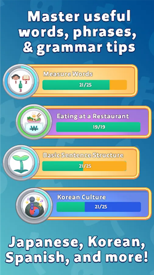 - Learn words and phrases that are relevant with content organized around useful themes like Ordering Food and Meeting New People
