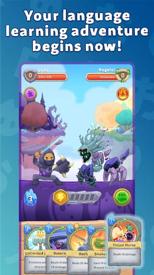Test your language learning skills in strategic monster battles. Draw ability cards from a personalized deck and answer language flashcards to play them. Lingo Legend is not like other language learning apps, it’s a real game!