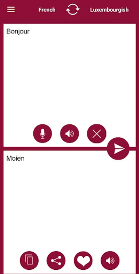 * App works in both mode, Luxembourgishto to French Translator or French to Luxembourgishto Translator.