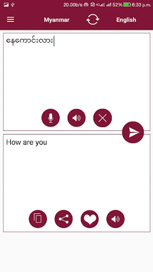 * App works in both mode, Myanmar to English Translator or English to Myanmar Translator.