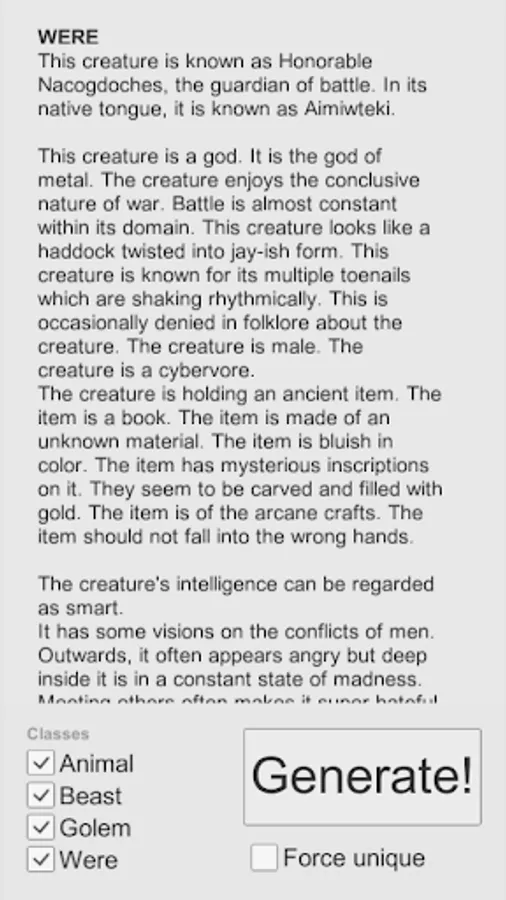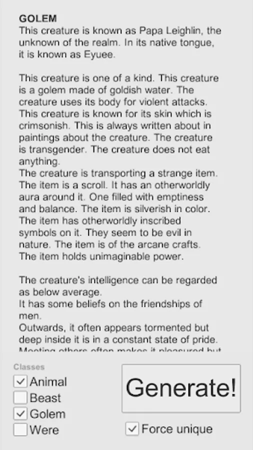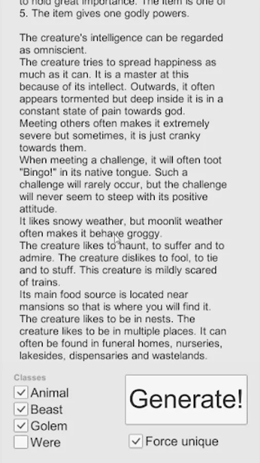 Beware that the generator can generate incoherent gibberish, so use the description as a general inspiration.
