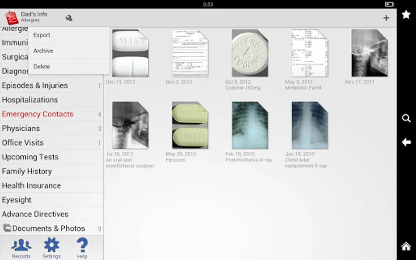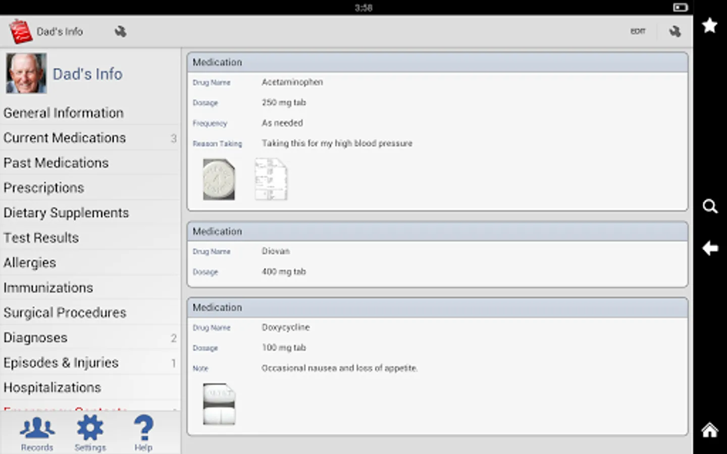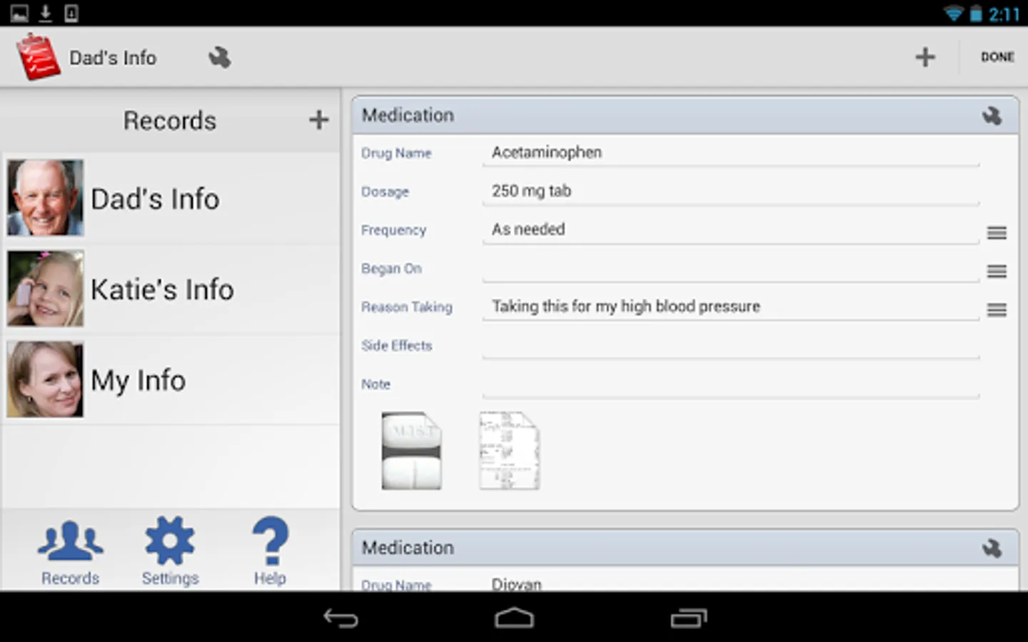 My Medical devotes an area to image files that can be attached to your record. You can tie files to particular items anywhere within your information. So add a picture of the pill next to a medication, or keep a copy of your insurance card alongside a provider's contact information.