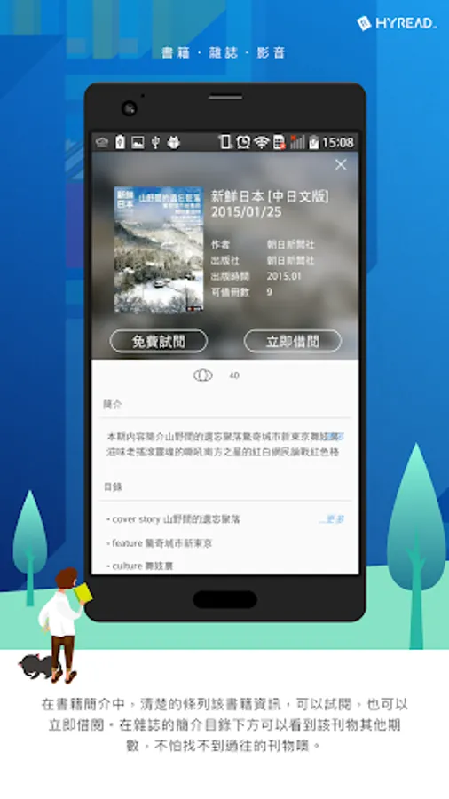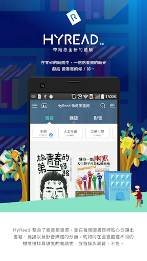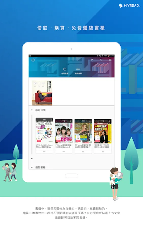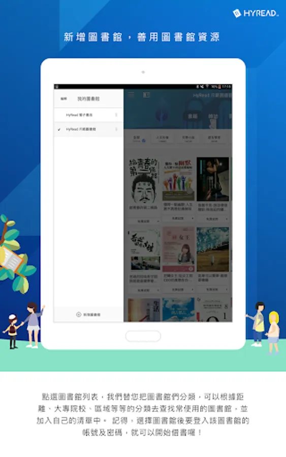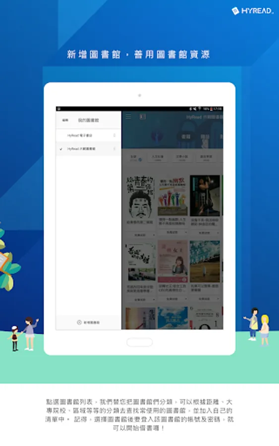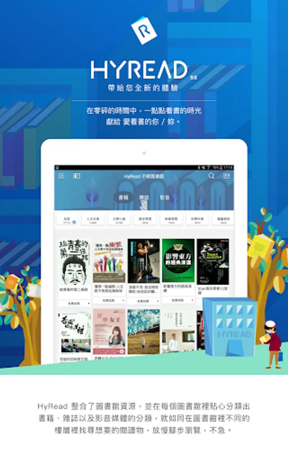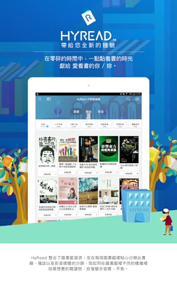 A new version, a new experience. Download the HyRead App now to borrow eBooks, magazines or videos from your library for free. Thousands of libraries in Taiwan, Hong Kong, Macao, and Southeast Asia have joined the ranks of HyRead. HyRead has tens of thousands of good books for you to read, don't hesitate, go and apply for an account in your library, and experience it immediately!