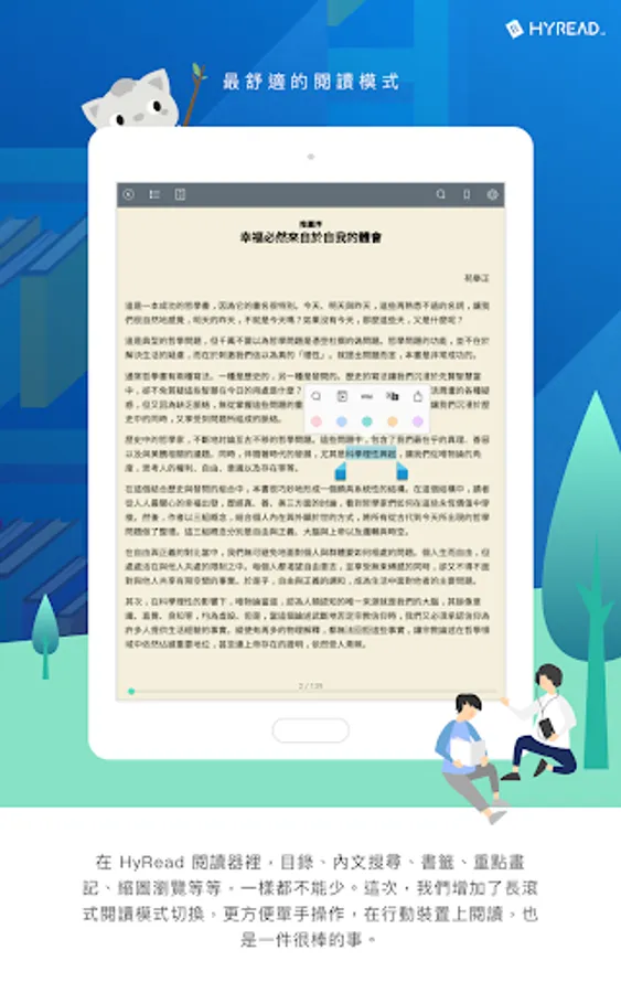 In order to be close to the user's usage habits, the HyRead operation interface is developed and designed based on user experience. The easy-to-find categories, smooth audio-visual media playback and intuitive reading mode bring HyRead readers a new reading experience. HyRead invites you to join us Experience e-book reading, welcome to download and give advice.